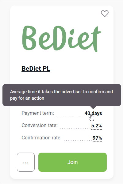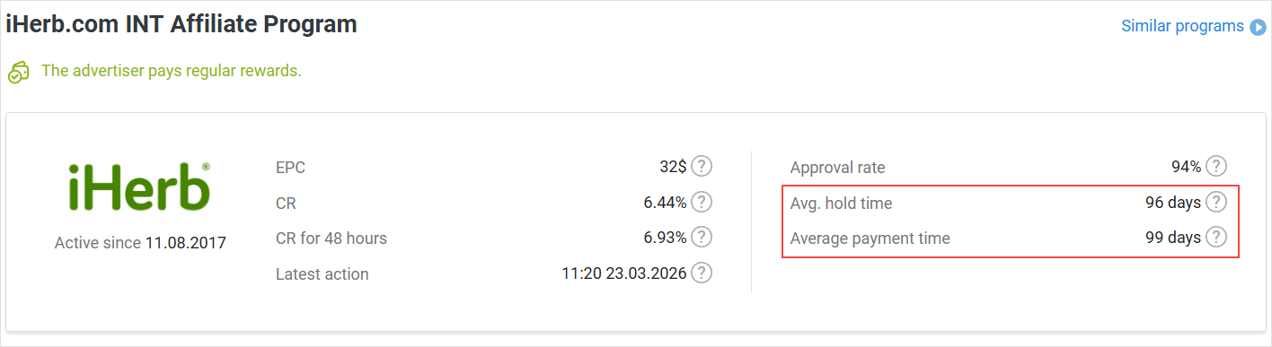 You can see the average time that it takes the advertiser to verify an action in the Payment term section on the program card in the catalog: