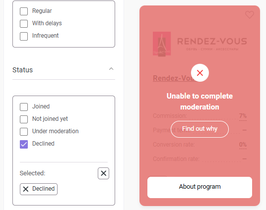 With that, the advertiser does not always decline publishers’ requests. Instead, the advertiser might keep them on hold until they need more publishers. In such a case, a join application can be being moderated for up to a month or even longer.
