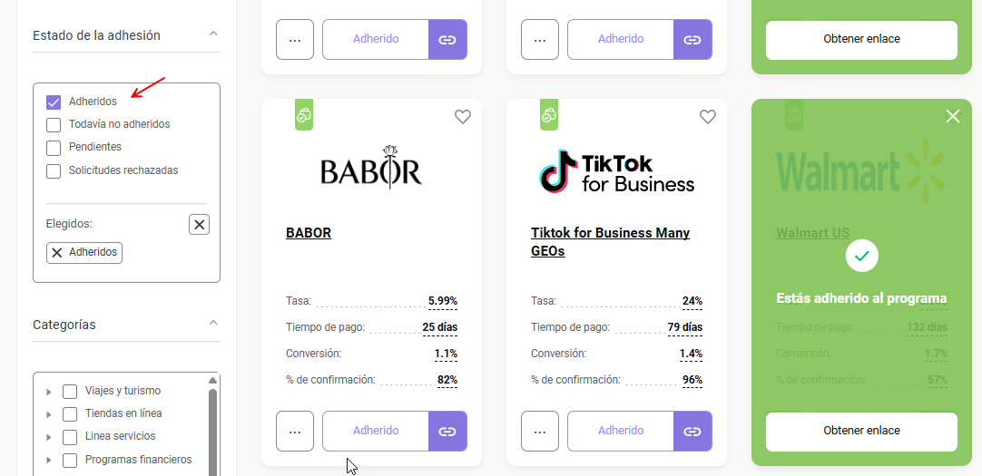 Para encontrar los programas a los que ya estás adherido, en la lista de programas en el filtro Estado de la adhesión, marca la opción Adheridos.