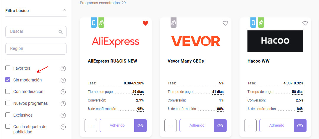 Por ejemplo, para encontrar programas a los que puedes adherirte instantáneamente, marca la opción Sin moderación en el filtro. Más sobre los filtros