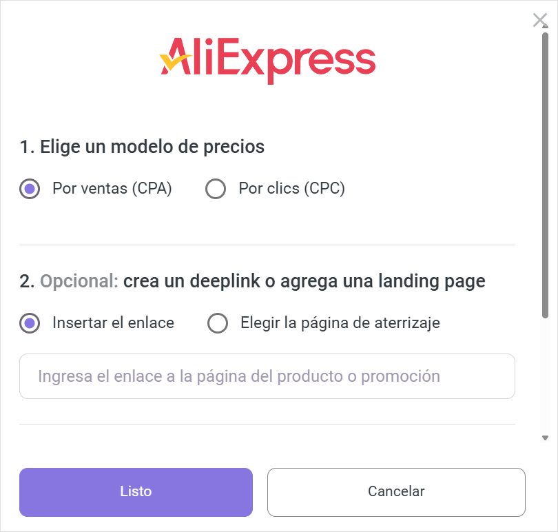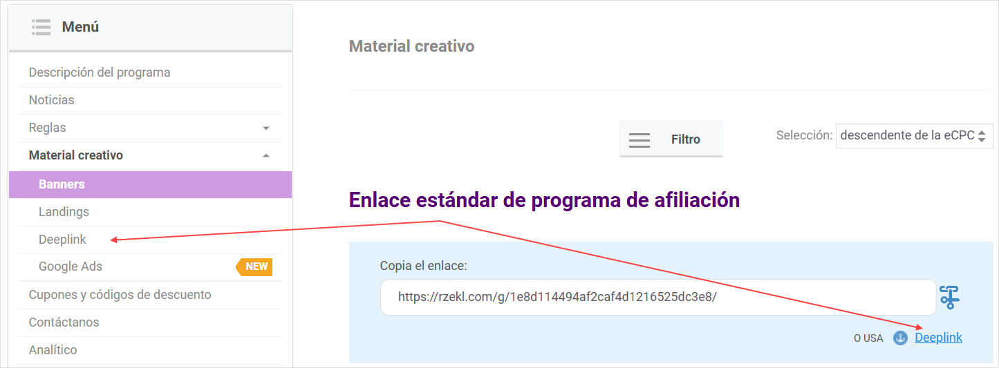 Deeplink — es un tipo de enlace de afiliación que lleva a la página del sitio web del anunciante que tú especificaste. Por ejemplo, la página de un producto, promoción o marca específicos.