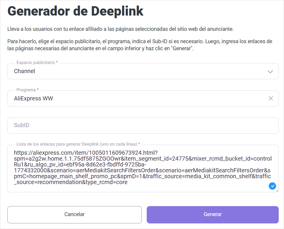 Si creas deeplinks para varios enlaces a la vez, el SubID indicado se agregará a cada uno de ellos.