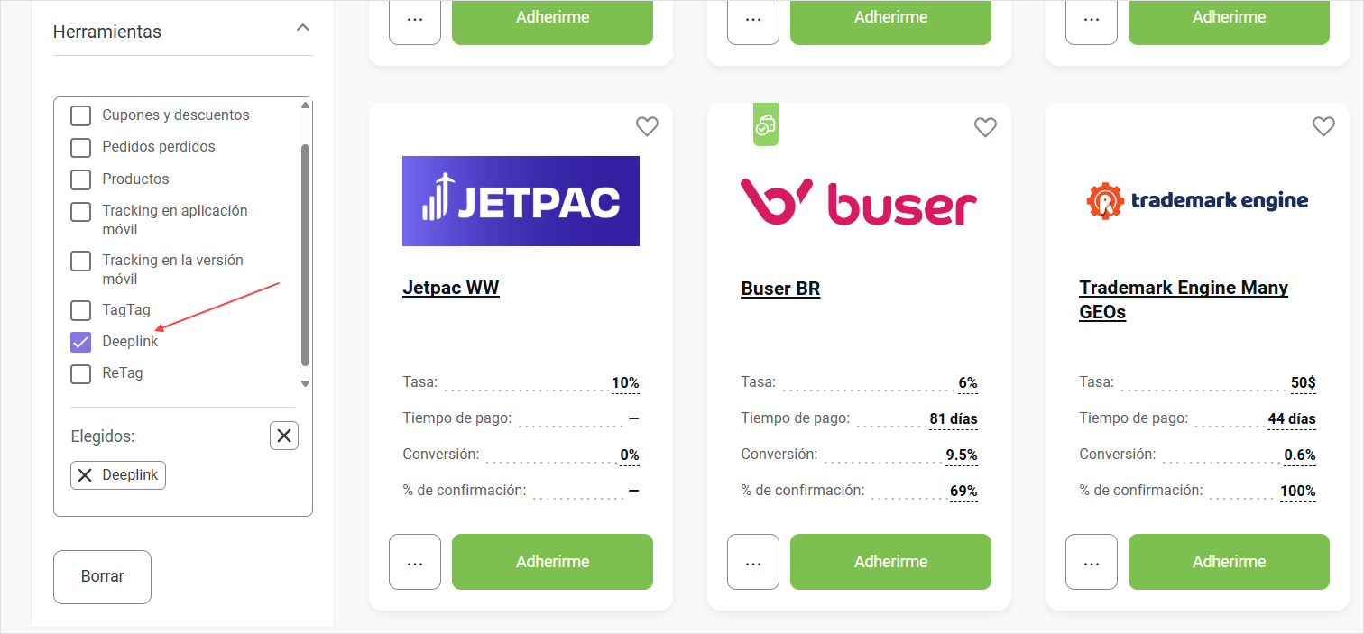 2. En el filtro Herramientas, marca la opción Deeplink. Verás los programas que admiten deeplinks.