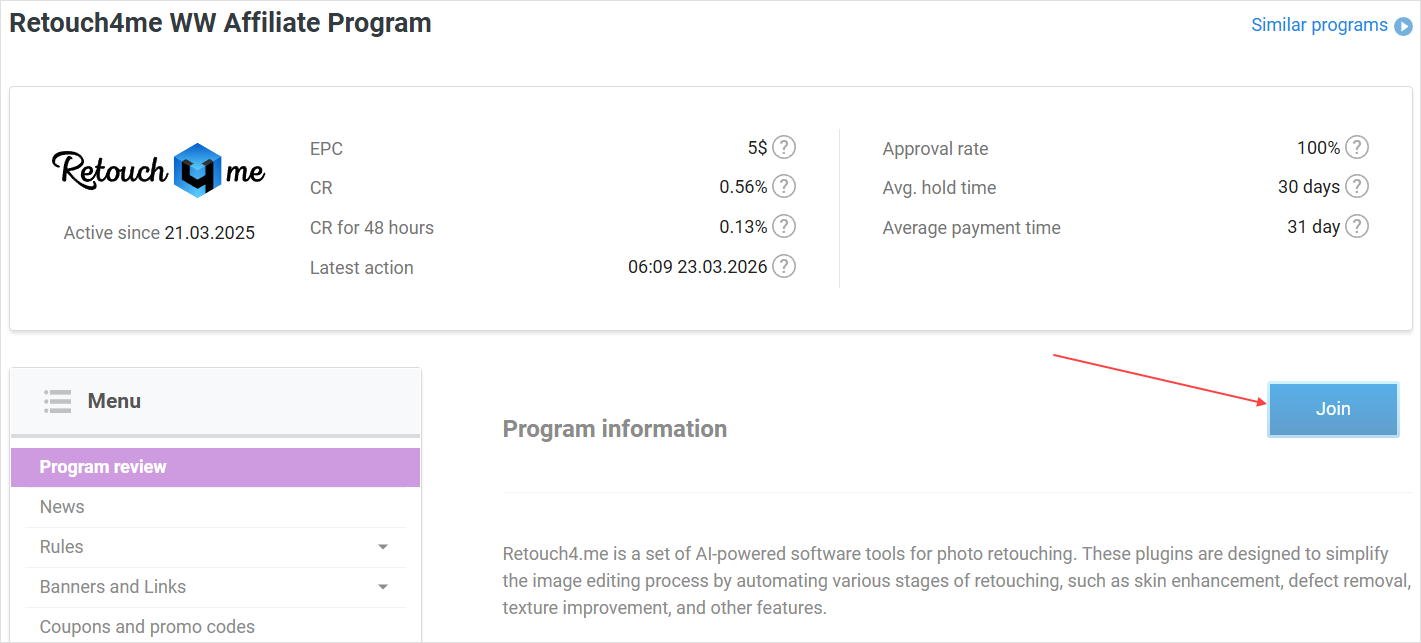 In the new window, read the program rules, check the box if you agree with them, and click Join again. Your join request will be submitted to the advertiser; they have to review it within 5 days. You can learn when moderation will be finished in the program card in the catalog.