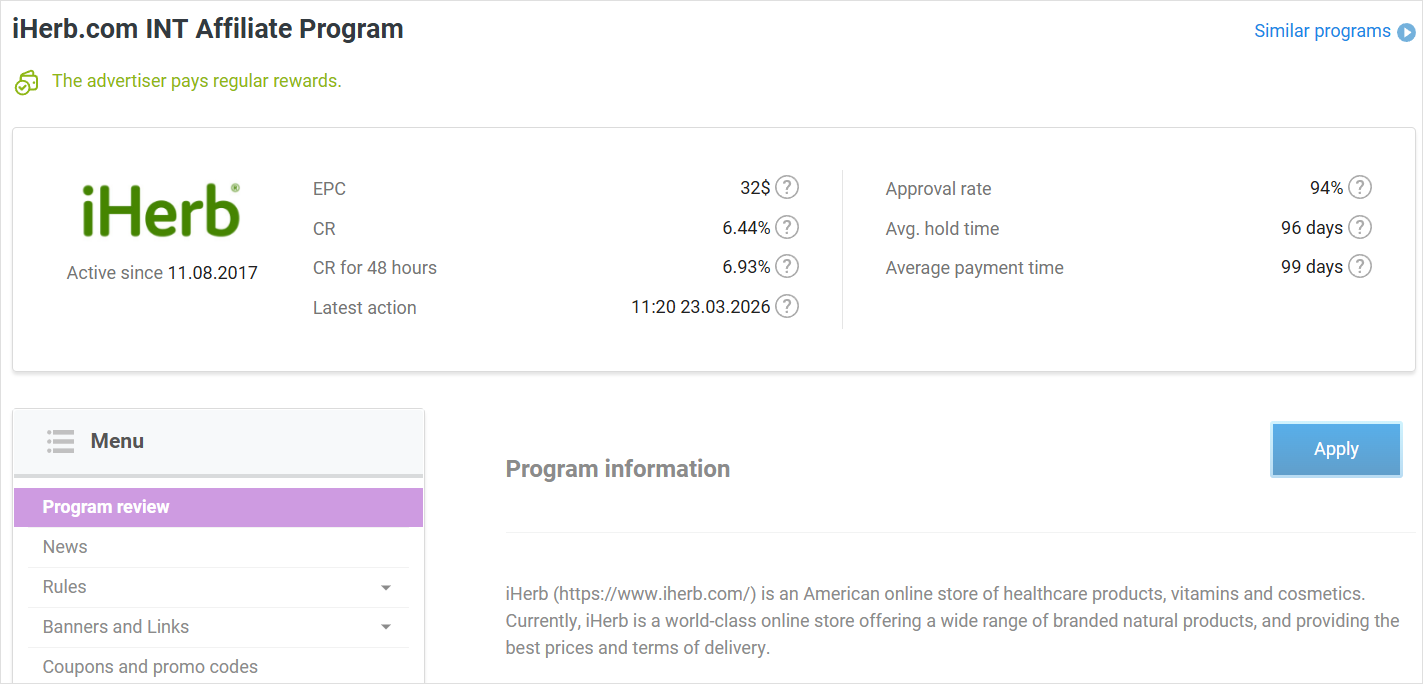 If you see the Apply button on the program page, this means the program is set up for manual moderation by the advertiser. To join the program, click Apply.