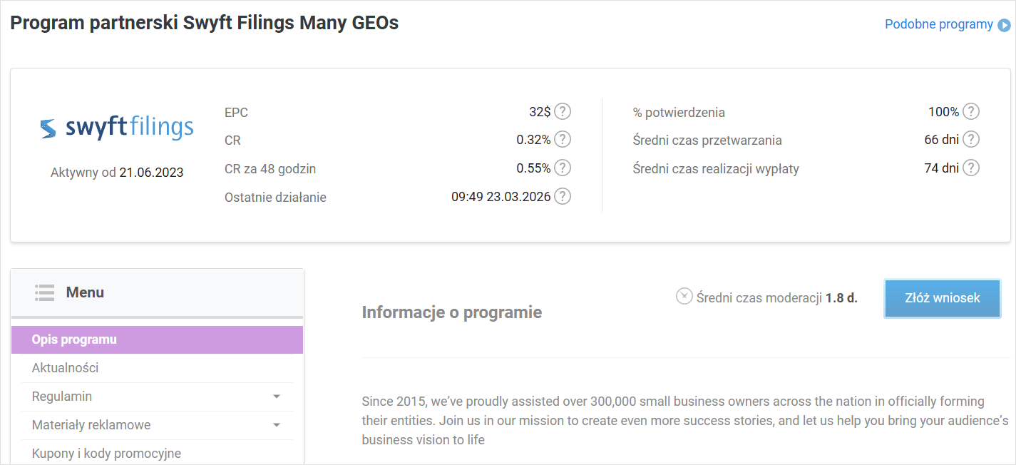 Jeśli w karcie programu widzisz przycisk Złóż wniosek, oznacza to, że reklamodawca sprawdza i akceptuje witryny ręcznie. Aby dołączyć do programu, kliknij Złóż wniosek.