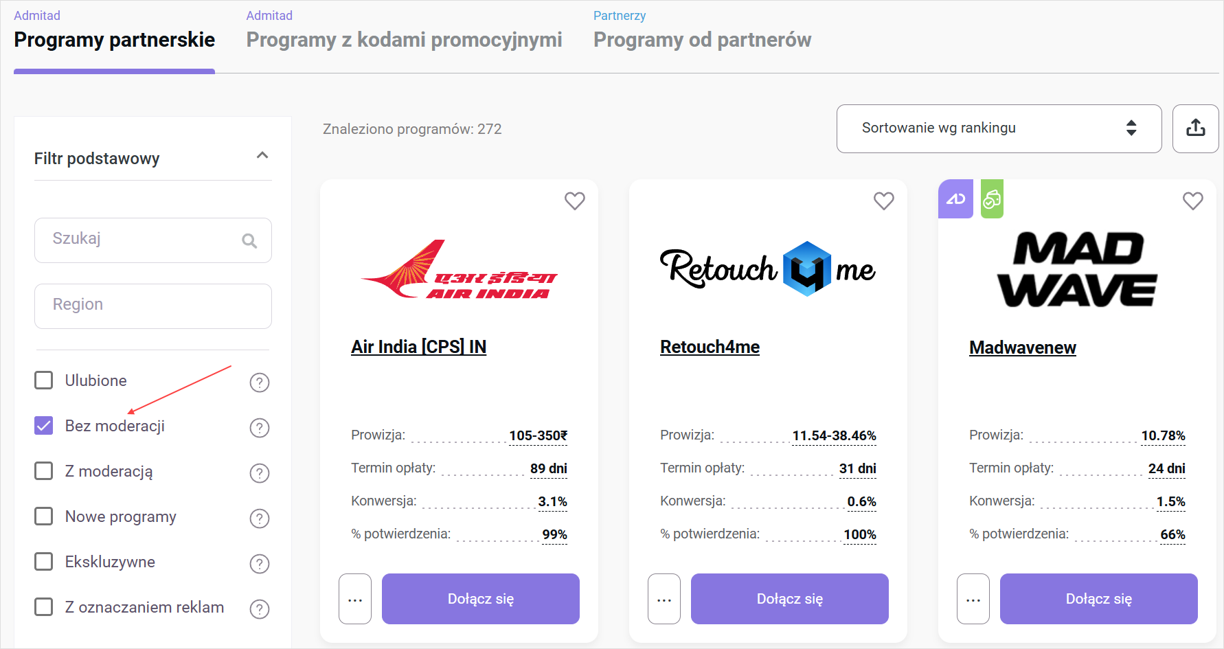 Przykładowo, aby znaleźć programy, do których można dołączyć natychmiast, w filtrze zaznacz opcję Bez moderacji. Dowiedz się więcej o filtrach