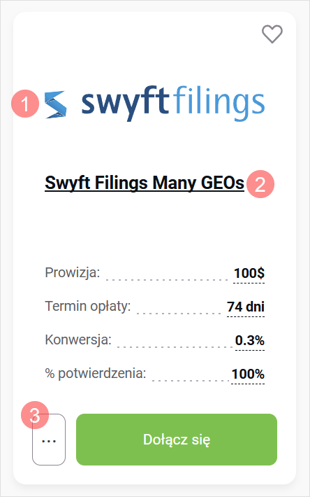 Jeśli w karcie programu widzisz zielony przycisk Dołącz się, to znaczy, że reklamodawca sprawdza i akceptuje witryny ręcznie. Aby dołączyć do programu, kliknij Dołącz się, zapoznaj się z regulaminem i, jeśli wyrażasz zgodę na jego warunki, kliknij Akceptuj.