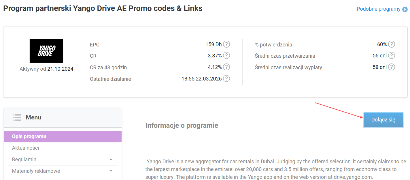 W nowym oknie zapoznaj się z zasadami programu, zaznacz, że wyrażasz zgodę na przedstawione warunki współpracy, i ponownie kliknij Dołącz się. Twój wniosek o podłączenie zostanie przekazany reklamodawcy, który powinien go rozpatrzeć w ciągu 5 dni. Aby dowiedzieć się, ile czasu zostało do końca moderacji, sprawdź kartę programu w katalogu.