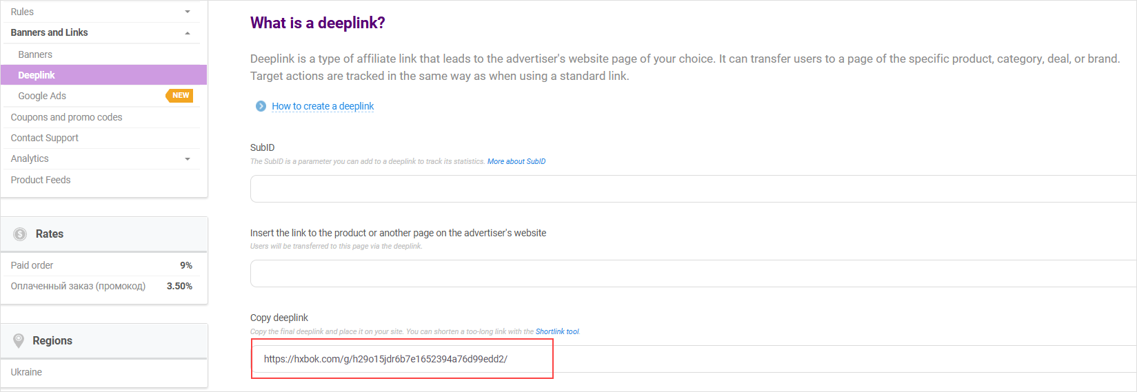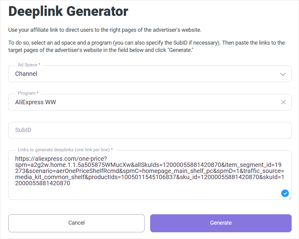 You can add a SubID to get reports on this very deeplink. For that, enter the value in the SubID Tracking field. It will be added to deeplink as a tag. Using this value, you will be able to track the clicks, actions, and other parameters for the created deeplink in the Reports on SubID section. More about SubID