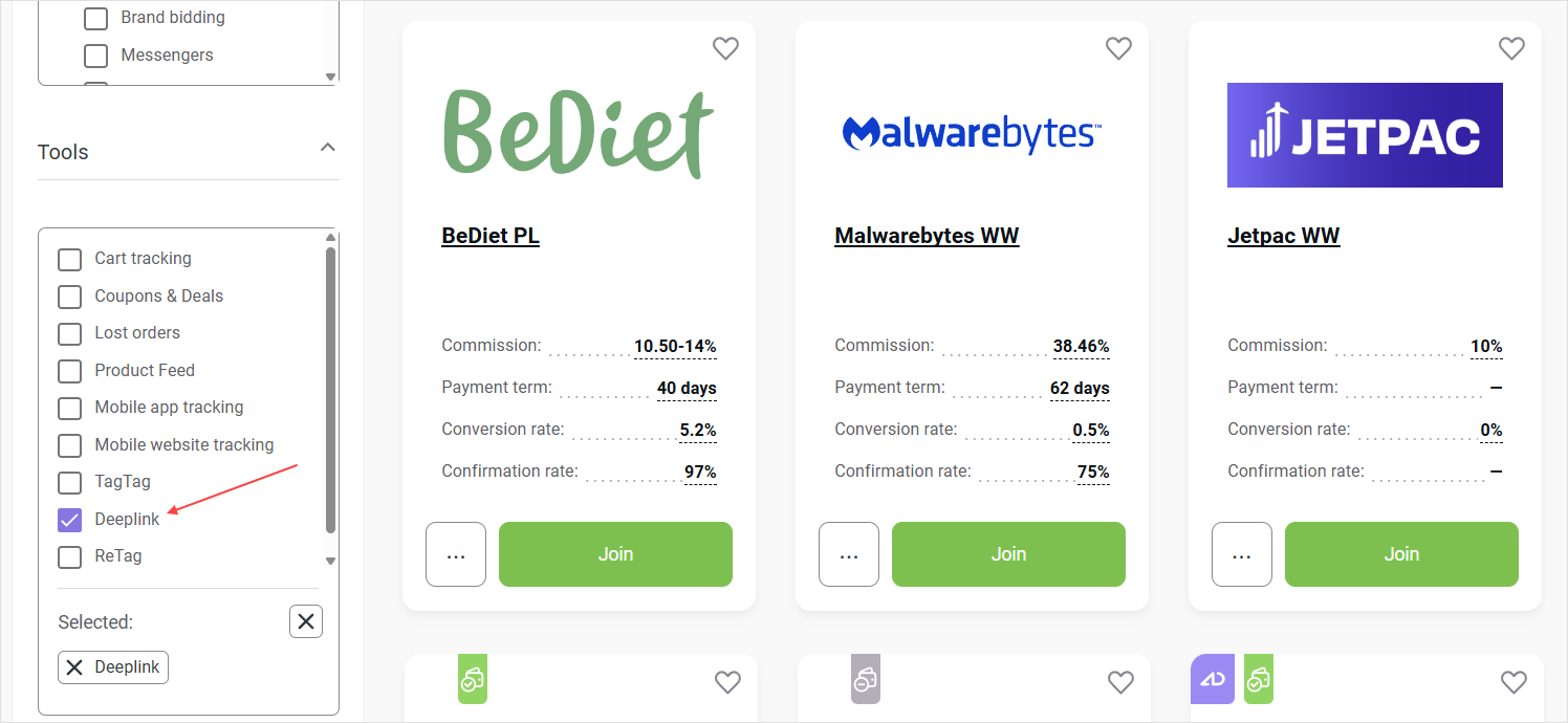 2. In the Tools filter, flag the Deeplink option. You will see the programs that support deeplinks.