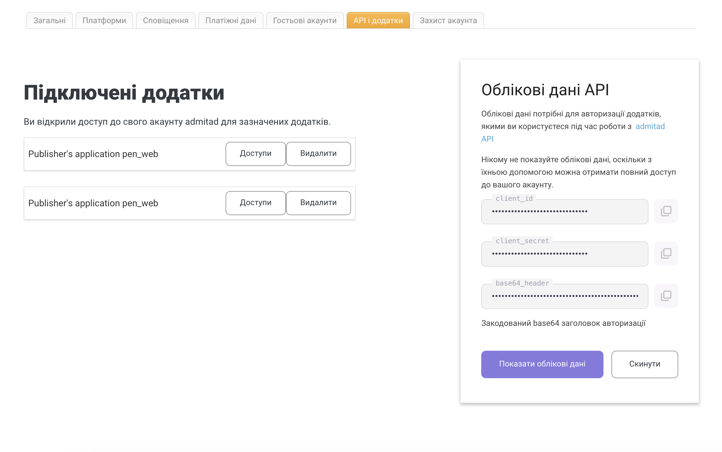Якщо ви знаєте або підозрюєте, що доступ було викрадено, скиньте дані. Після цього буде згенеровано новий client_secret. Врахуйте, що після скидання всі застосунки, які використовують цей ключ, буде відключено.