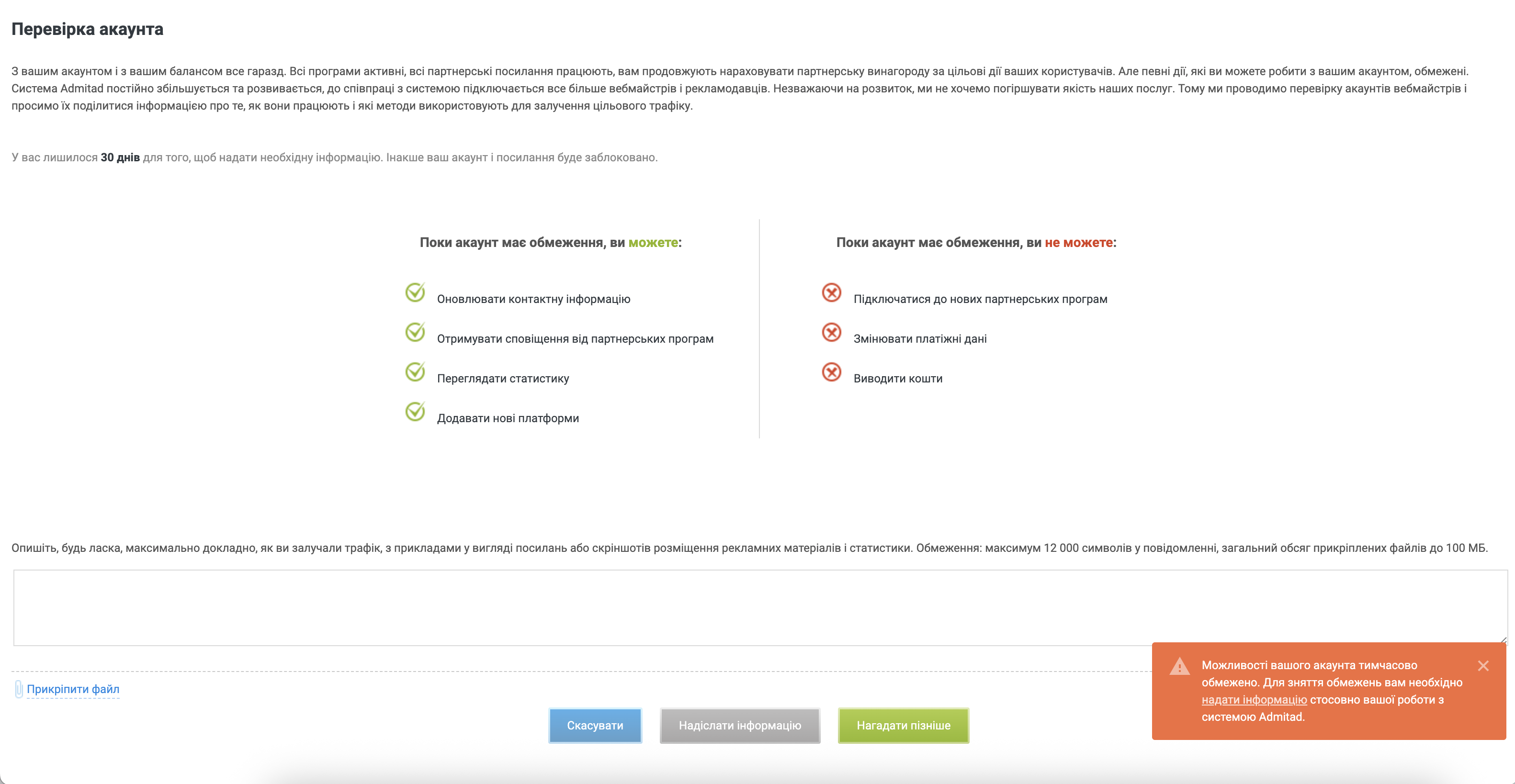 Якщо ви залучаєте якісний трафік і працюєте без порушень, ви успішно пройдете перевірку, і з вашого акаунта знімуть обмеження.