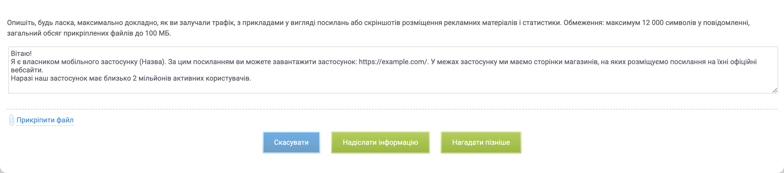 Якщо ви надали недостатньо докладної інформації, спеціаліст відділу якості запитає у вас більше даних щодо джерел трафіку (статистика, скріншоти тощо) або поставить додаткові запитання.
