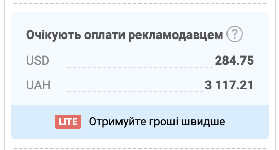Версія Lite дозволяє перевести кошти зі статусу «Очікують оплати рекламодавцем» у статус «Готові до зняття». У результаті ви отримаєте кошти ще до того, як рекламодавець оплатить дії.