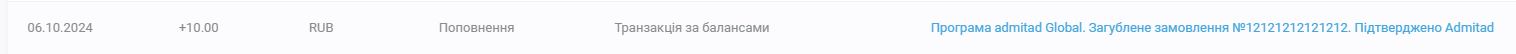 - Транзакція за балансами — ця причина використовується для ручних операцій з балансом, а також для нарахування винагороди за ті заявки з інструмента Втрачені замовлення, які були підтверджені Admitad без участі рекламодавця. Така транзакція буде з коментарем: «Програма {назва програми}. Втрачене замовлення №{номер замовлення}. Підтверджено Admitad».