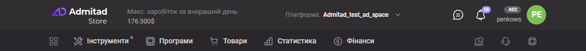 На головній сторінці представлена інформація про ваш баланс, загальна статистика за платформами за 30 днів і останні новини про партнерські програми Admitad. Детальніше: «Головна сторінка вебмайстра»