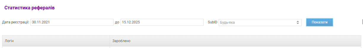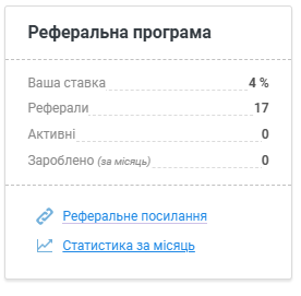 - Реферали — кількість рефералів, які зареєструвалися у системі за вашим посиланням.