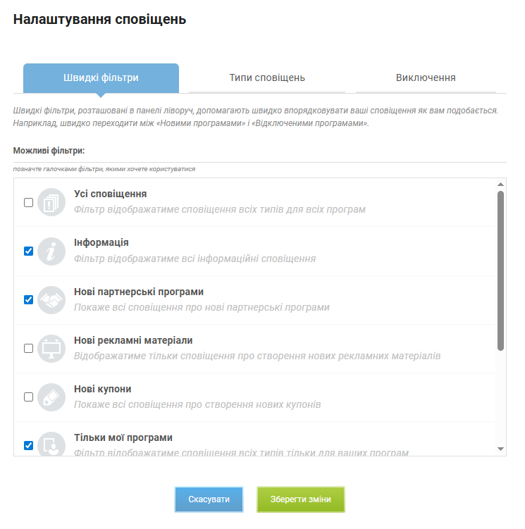 Щоб налаштувати панель, перейдіть на вкладку Швидкі фільтри та позначте позначками потрібні фільтри сповіщень.