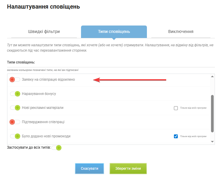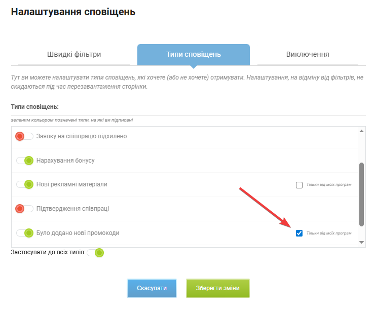 На вкладці Типи сповіщень оберіть, про які події ви бажаєте отримувати сповіщення.