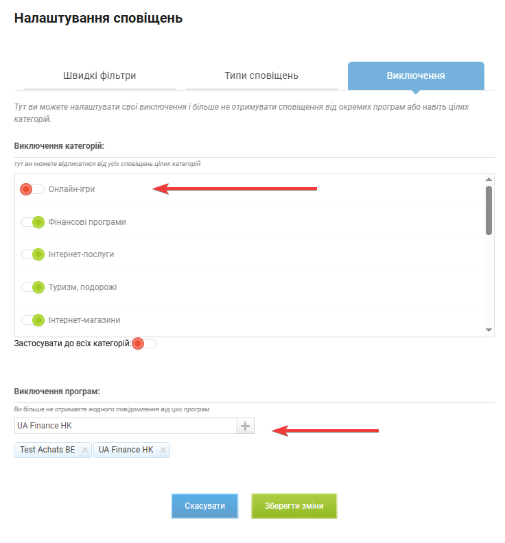 - Щоб відмовитися від сповіщень про певні категорії програм, за допомогою перемикача деактивуйте їх у блоці Виключення категорій та збережіть зміни.