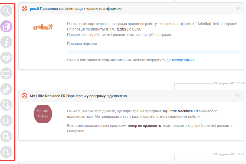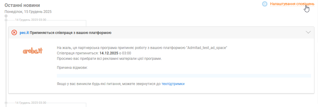 У блоці Останні новини відображаються всі зміни, пов'язані з партнерськими програмами: підключення нових програм, додавання рекламних матеріалів, нарахування бонусів тощо.