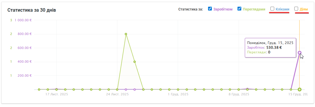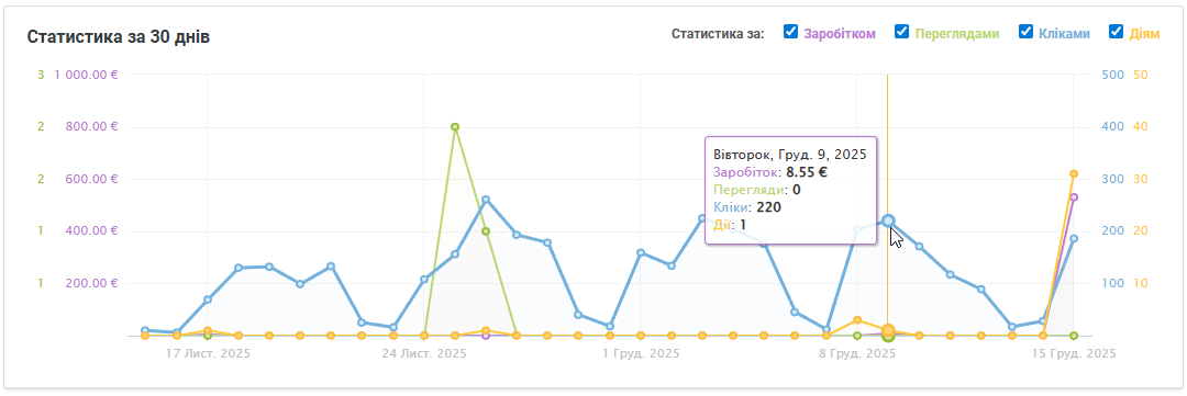 - за заробітком — сума зароблених коштів по всіх ваших платформах за день. Враховується винагорода за дії у всіх статусах: «Очікує», «Підтверджено», «Відхилено», «Підтверджено, очікує оплати рекламодавцем»;