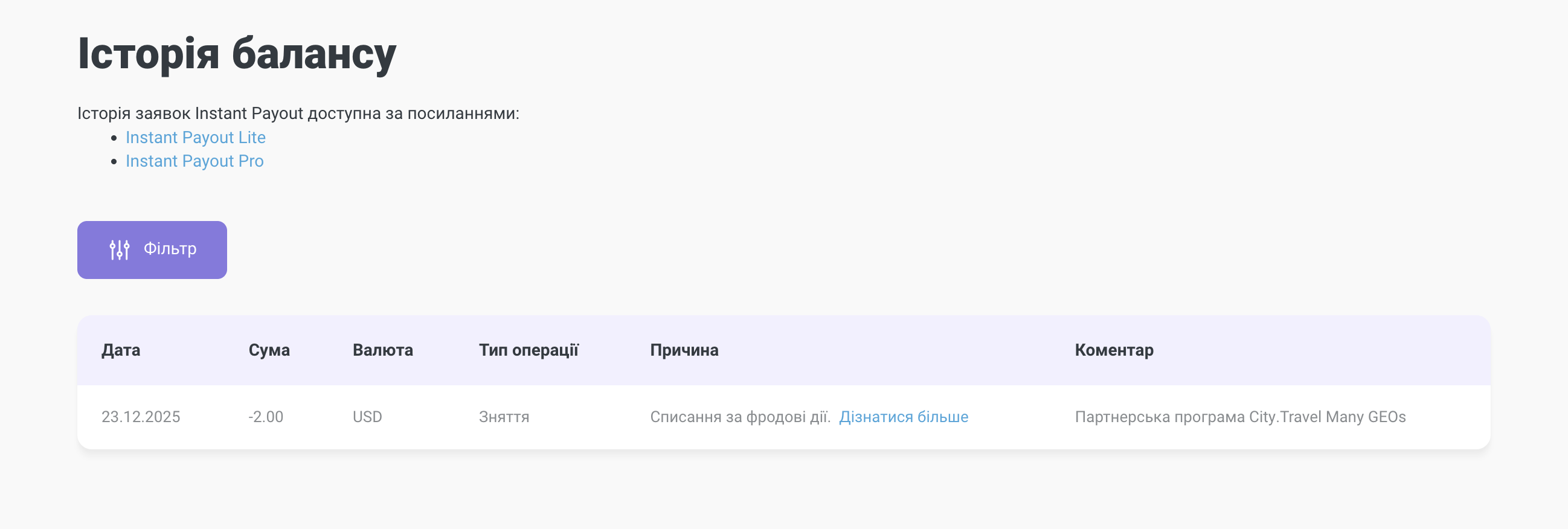 Якщо кошти за відхилені дії за партнерською програмою були списані у кількох валютах, то в Історії балансу з’явиться окрема операція зі списання для кожної з валют. При цьому докладний звіт у кожному списанні міститиме всі дії, винагороди за які були повернуті рекламодавцю в межах однієї обробки фродових дій.